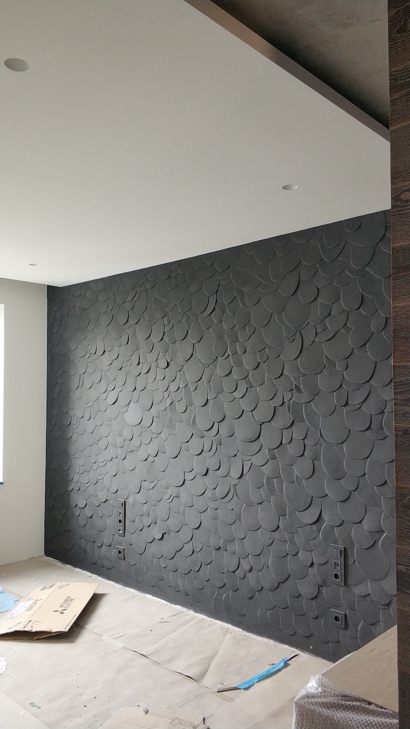 Вторым интересным элементом отделки 2-х комнатной квартиры является разработанная дизайнером и вручную созданная 3D стенка в виде объемных чешуек окрашенных в графитовый цвет и покрытых декоративным составом с эффектом Soft touch, приятным для прикосновений.
