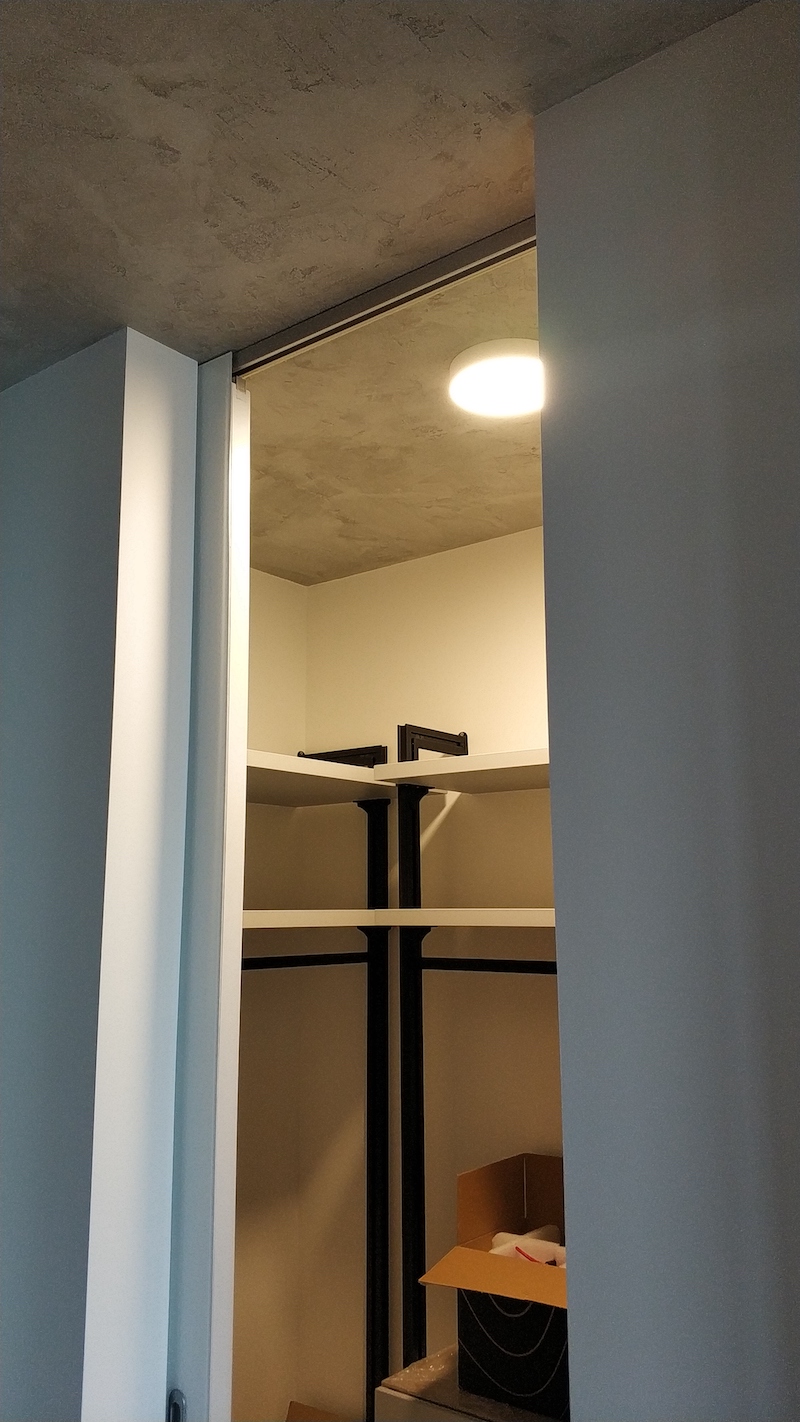 По дизайн проекту декоративной штукатуркой под бетон оформлялись стены и элементы потолка. В сочетании с четкими линиями идеально окрашенного потолка из гипсокартона эффектность декоративного бетона увеличивается в разы и добавляет интерьеру уют и неповторимость.