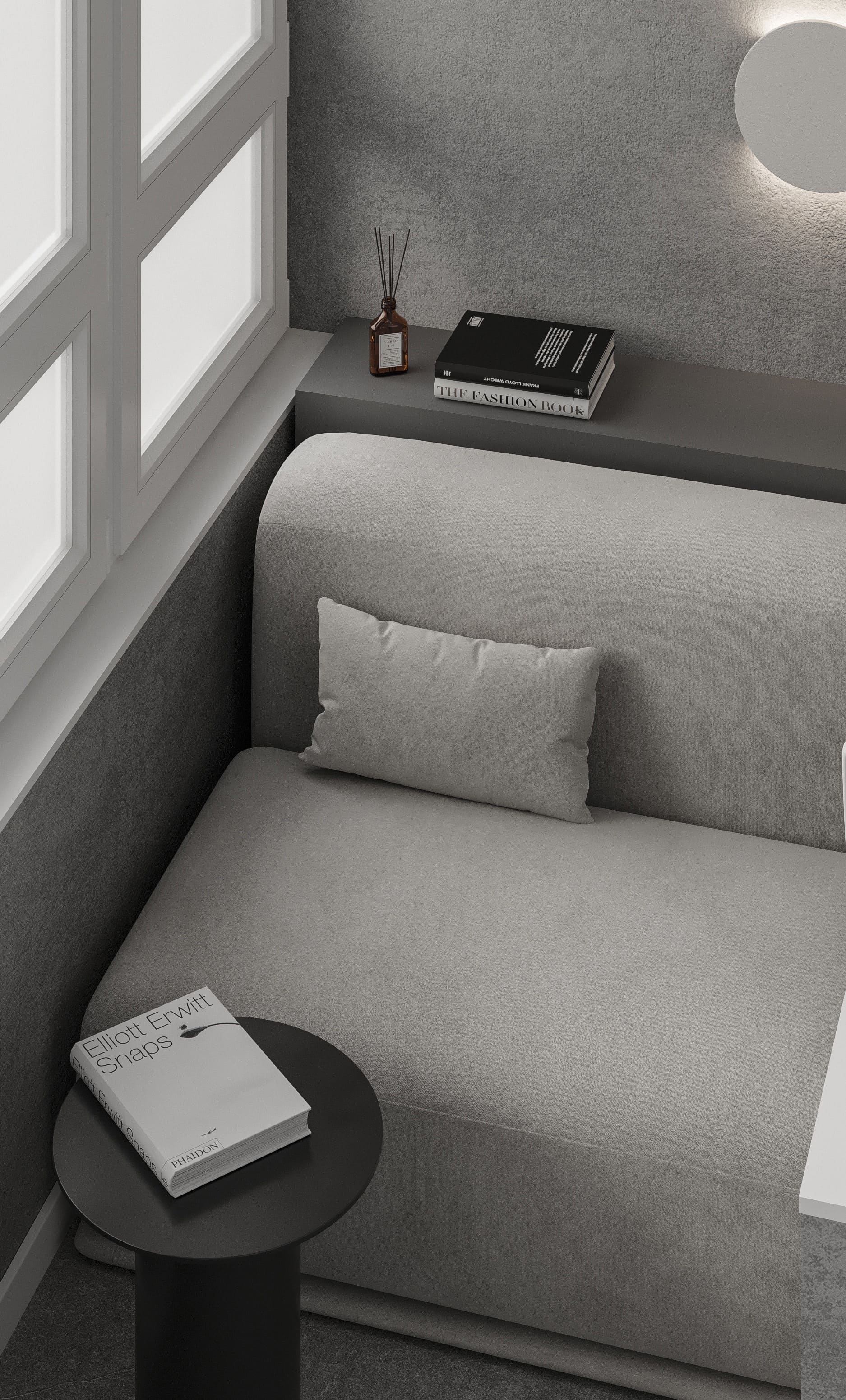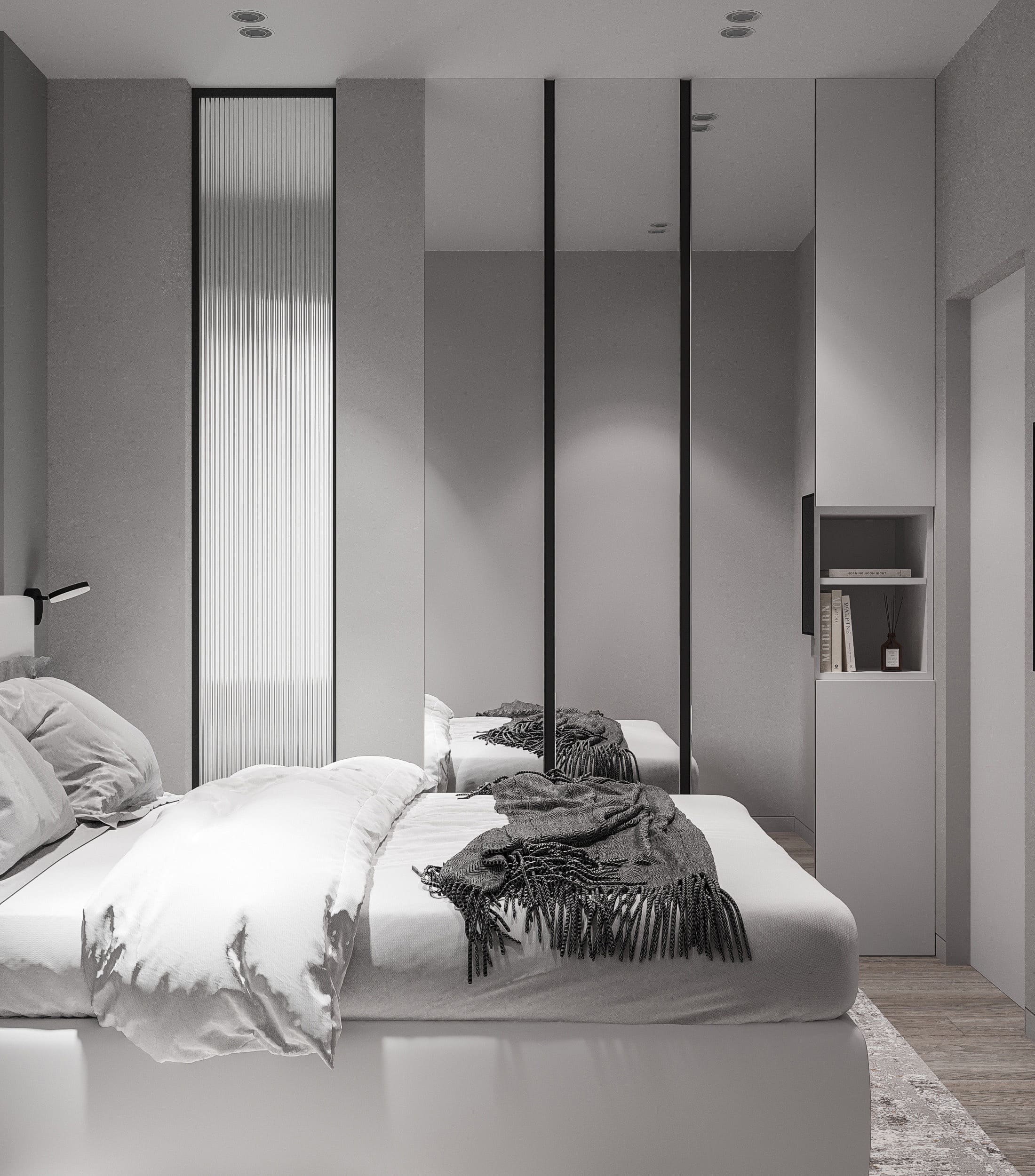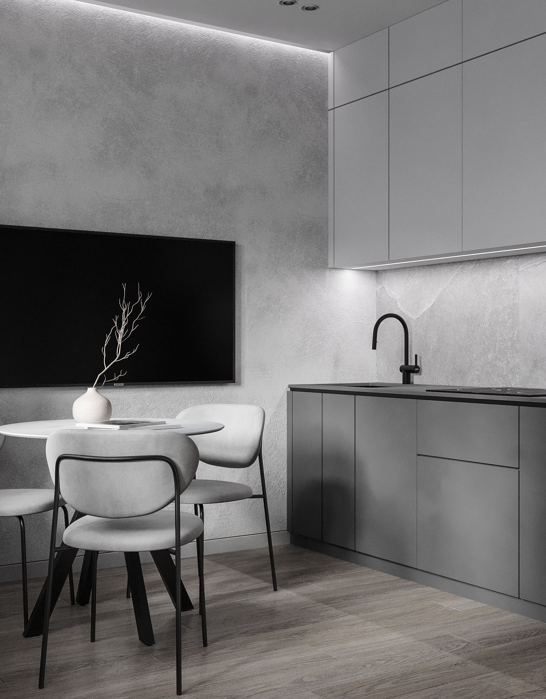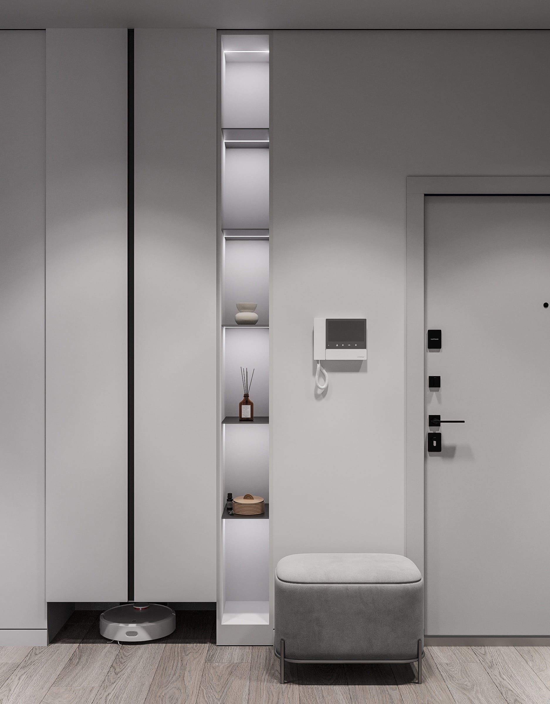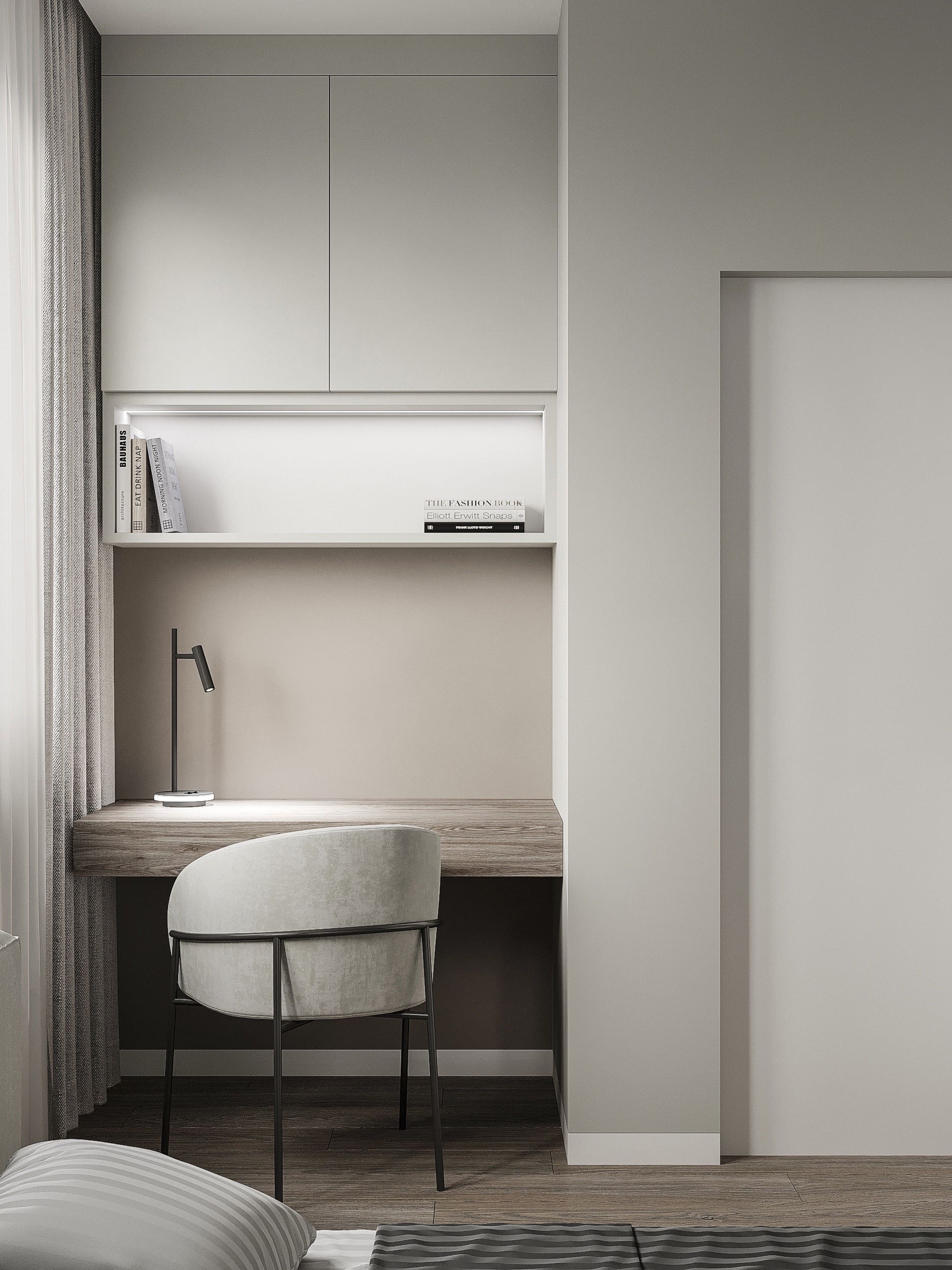 Интерьер сочетает современный стиль, функциональность и уют. Зонирование пространства учитывает комфорт и практичность, предусмотрены встроенные системы хранения.