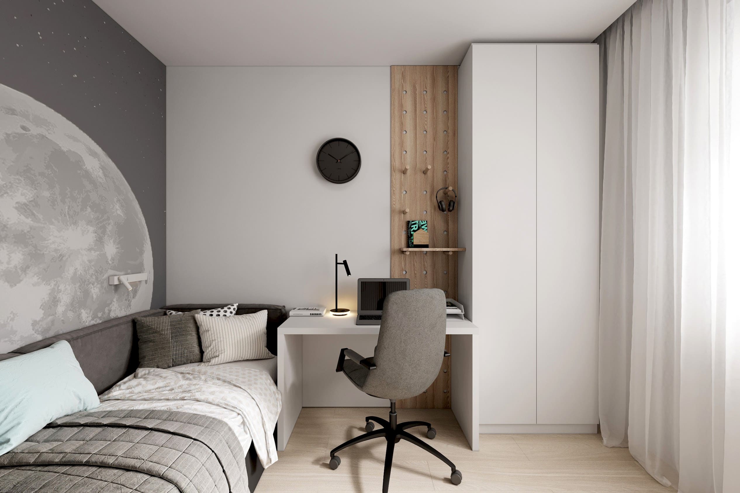 Дизайн интерьера трёхкомнатной квартиры для семьи с детьми. Цветовая гамма – светлые нейтральные оттенки с тёплыми деревянными акцентами.