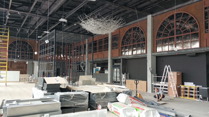 Ещё одним интересным этапом работы на данном проекте было создание логотипа в виде отлитого листа металла, в котором вырезан логотип ресторана со встроенной внутрь подсветкой. Вес логотипа получился в районе 30 кг, и его без особых проблем смонтировали на стене, в то время как вес настоящего листа металла такого же размера достигал бы 500-700 кг, и для его монтажа необходима подконструкция и немалые усилия.