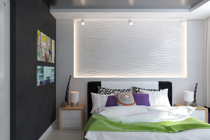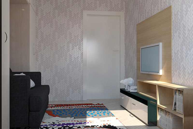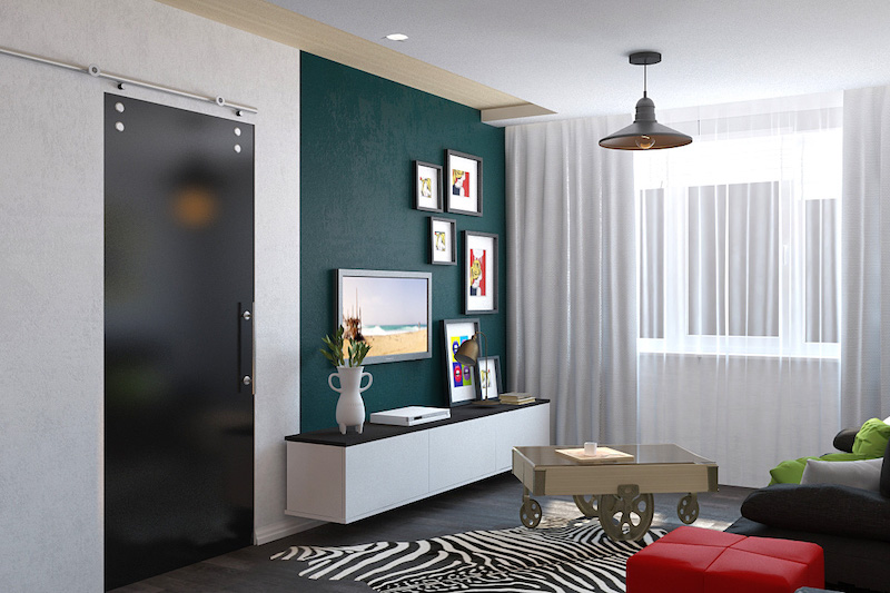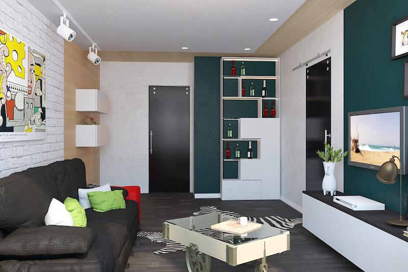 Дизайн интерьера трехкомнатной квартиры в современном стиле с элементами фьюжн для проживания 1-2 взрослых. Цветовая гамма – белый, черный, серый. Яркие акценты – бирюзовый, красный, зеленый.