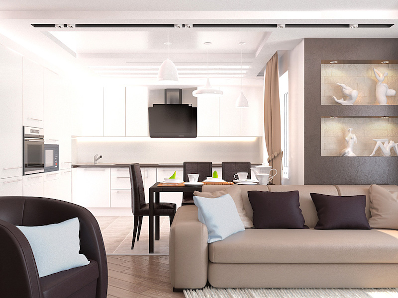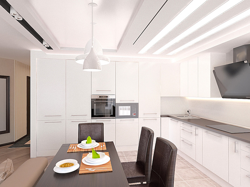 - Множество форм освещения, разнообразные центральные и настольные светильники, световые линии и светодиодная подсветка, точечные встроенные светильники.