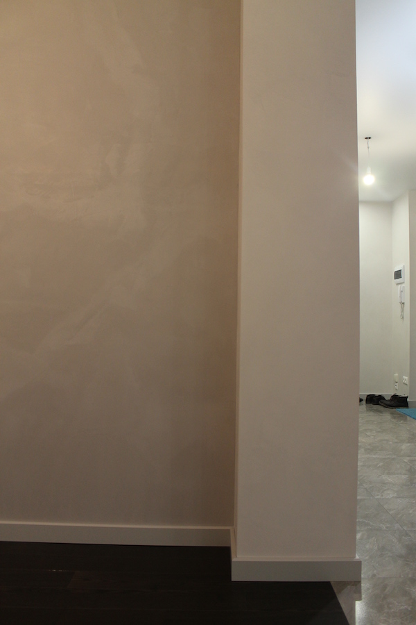Интересным этапом данного ремонта в двухкомнатной квартире под ключ было оформление стен декоративной штукатуркой, которая обладает высокой прочностью, приятна тактильно и обладает красивым внешним видом, создающим приятную и домашнюю атмосферу.