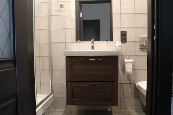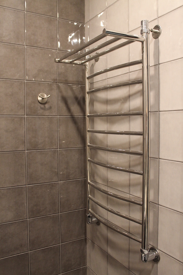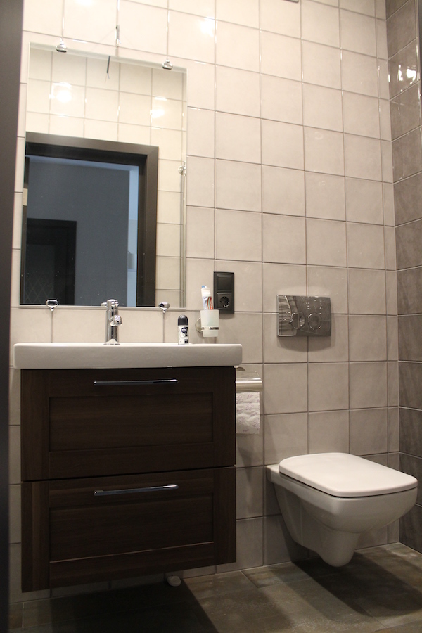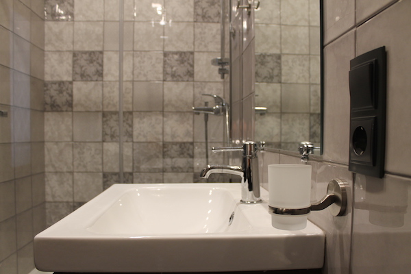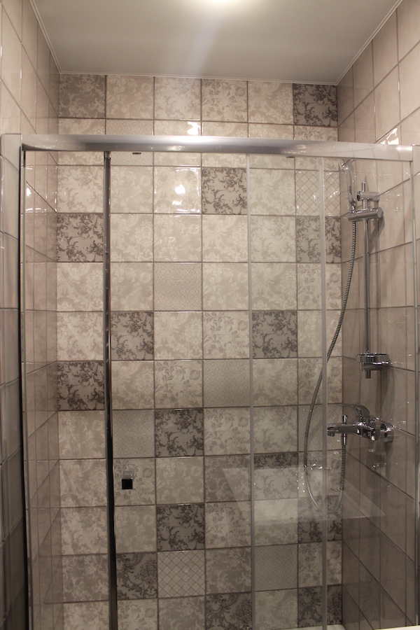 В ванной и на кухне для отделки стен использовался керамогранит.