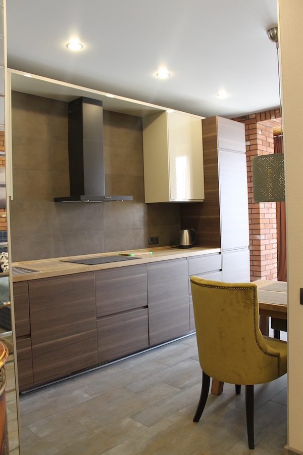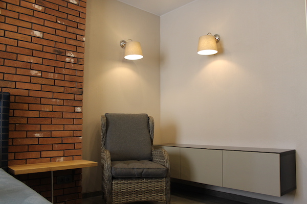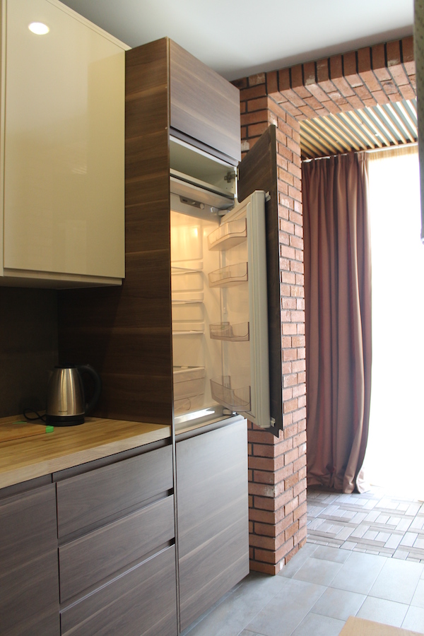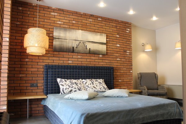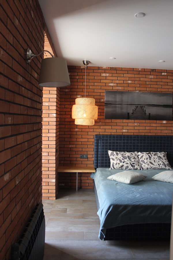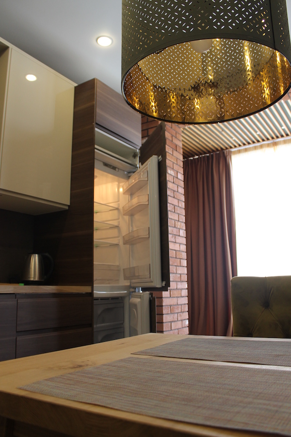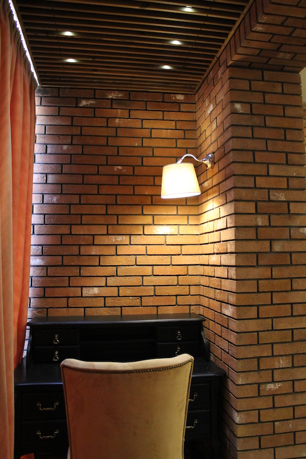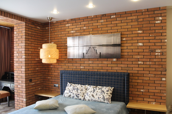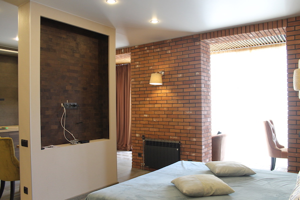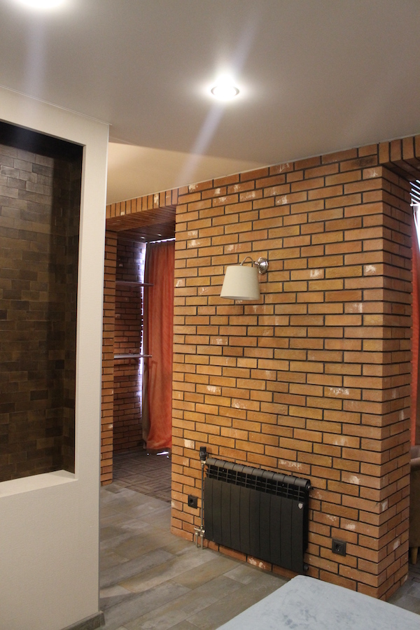 Интересным этапом ремонта однокомнатной квартиры на данном проекте было оформление стен комнаты и лоджии декоративным кирпичом. Несмотря на то, что его используется много в данном проекте, интерьер новостройки получился очень теплым и уютным, но с мужским характером, в чем вы можете убедиться, просмотрев Галерею.
