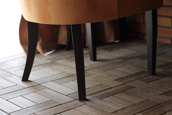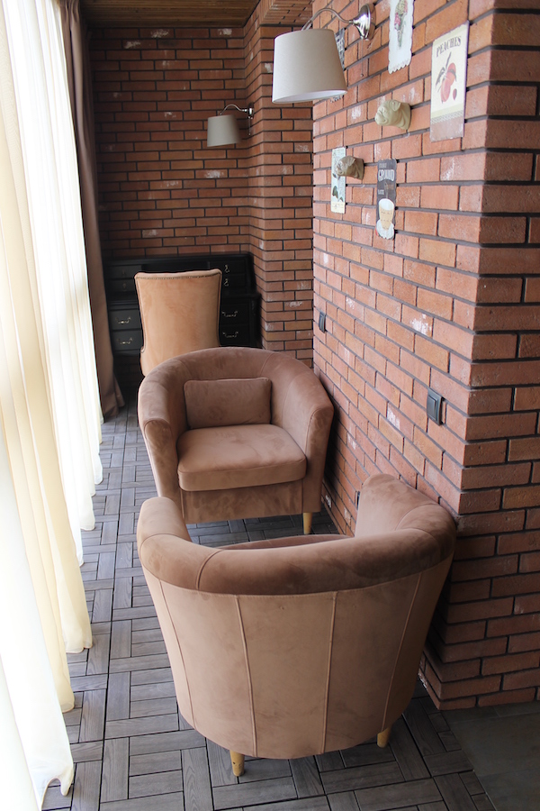 На полу лоджии была уложена террасная тоска в виде брусков с рисунком квадрат, выполнен реечный потолок.