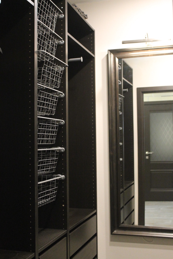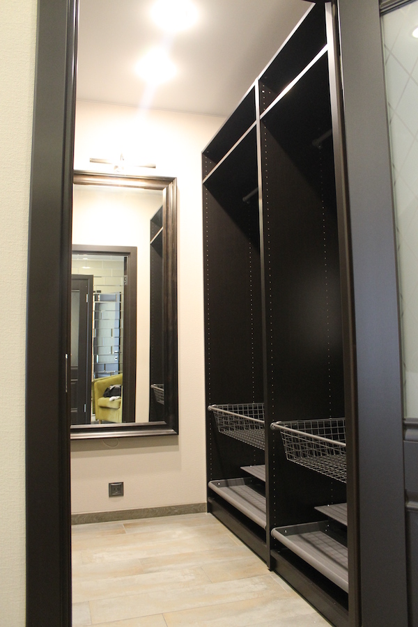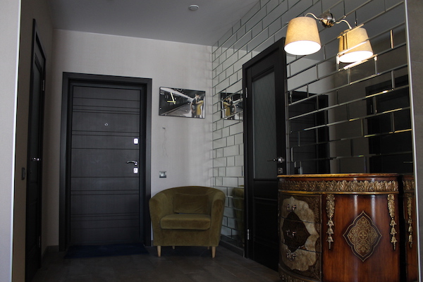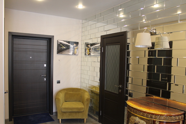 В коридоре для отделки стен выбрана зеркальная плитка, которая позволяет зрительно расширить небольшое помещение с несколькими дверями.