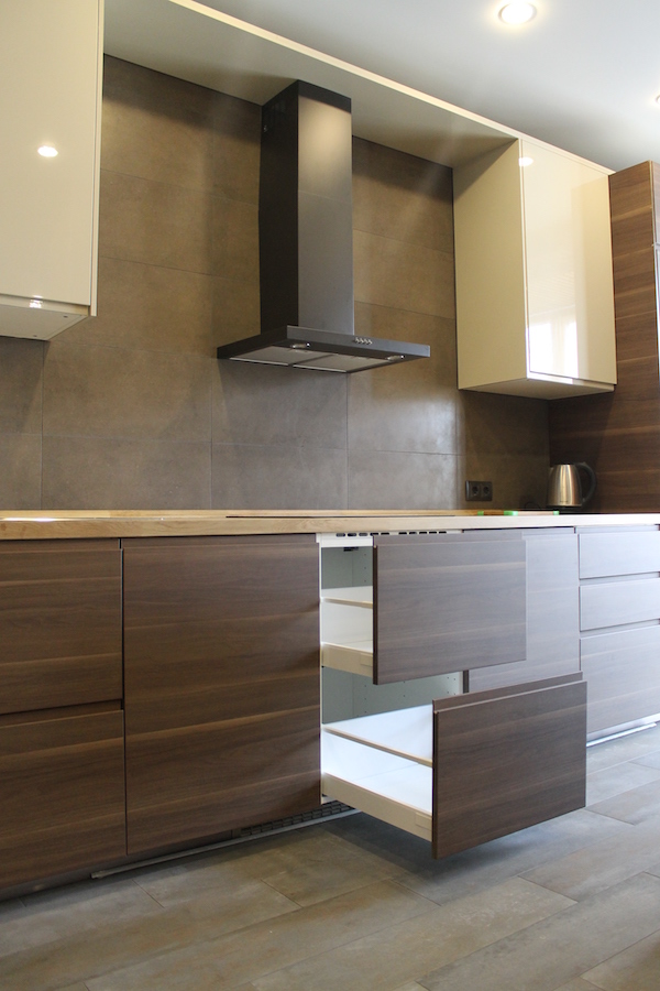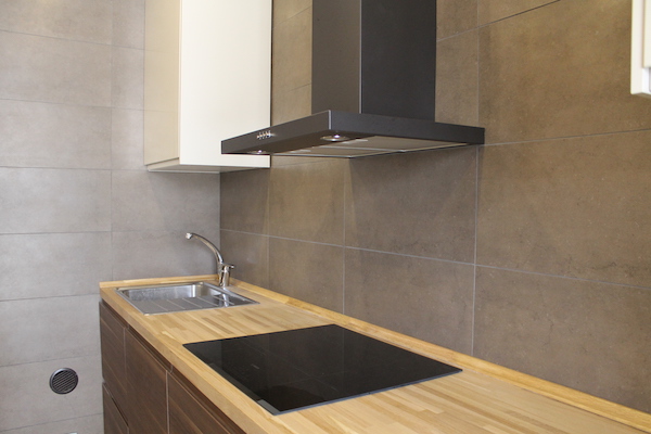 - на пол в зоне кухни и в санузлах выполнена укладка плитки и ламината, стены – облицовка плиткой.